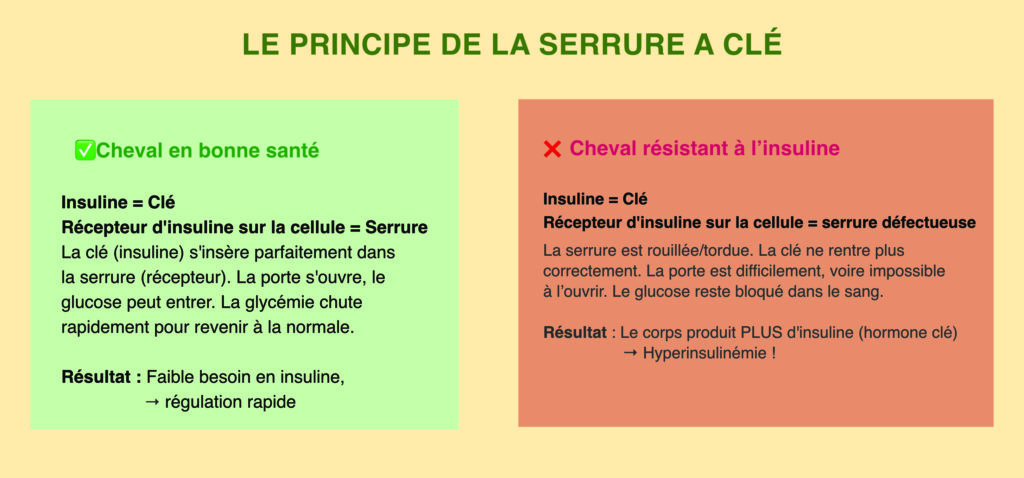 Le phénomène insidieux est le suivant : les cellules « souffrent de faim » malgré une irrigation sanguine normale ! Le glucose est présent, mais il ne peut pénétrer dans les cellules. Le cheval se sent léthargique et a constamment faim, même si son taux de sucre sanguin est normal.